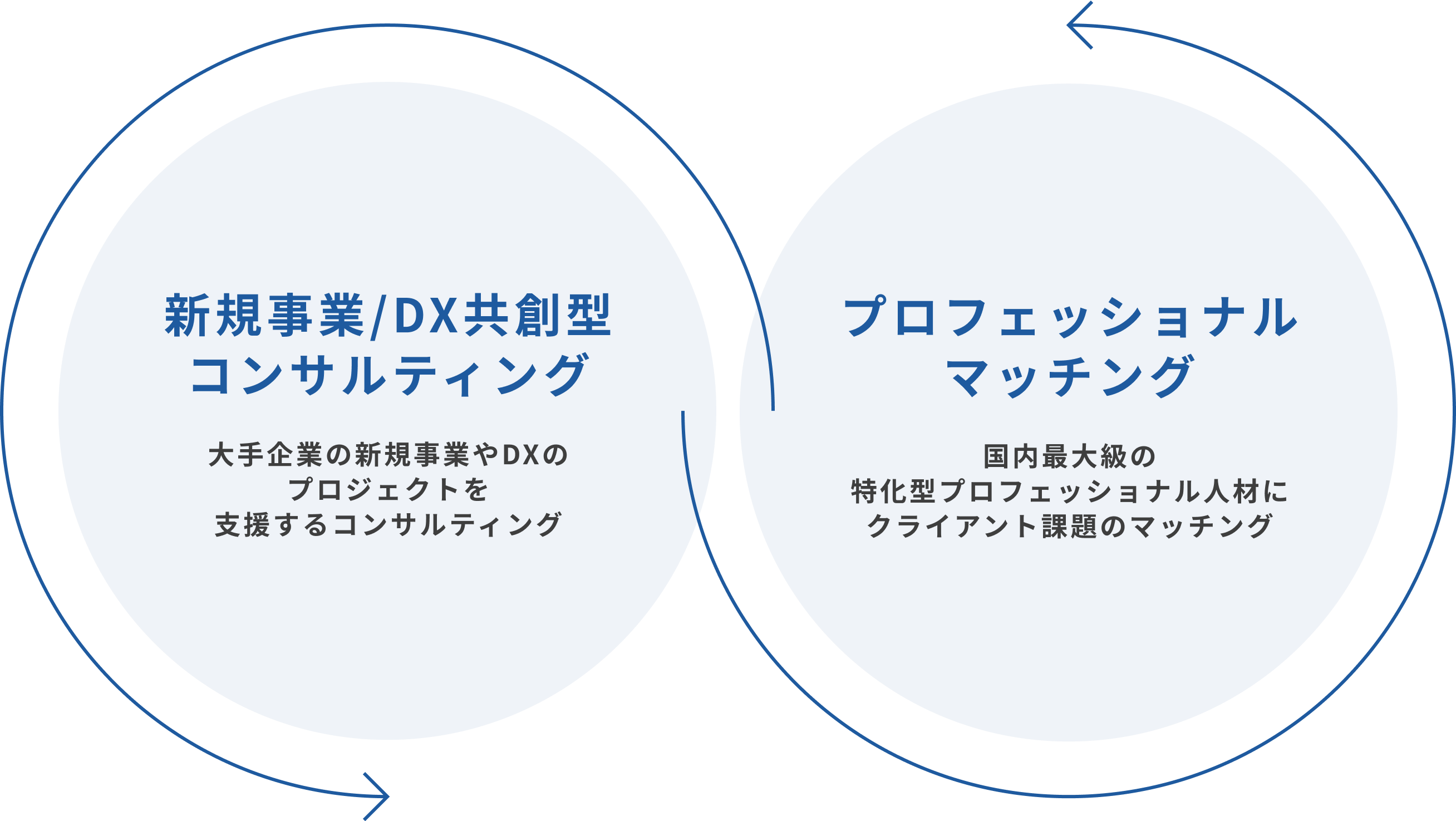 高度な経験と専門スキルを保有するフリーランス等の新規事業DXコンサルティング人材と、企業をマッチングし、プロジェクトの体制構築・成果創出を支援します。